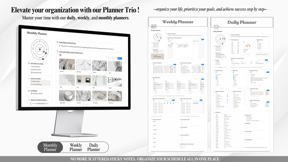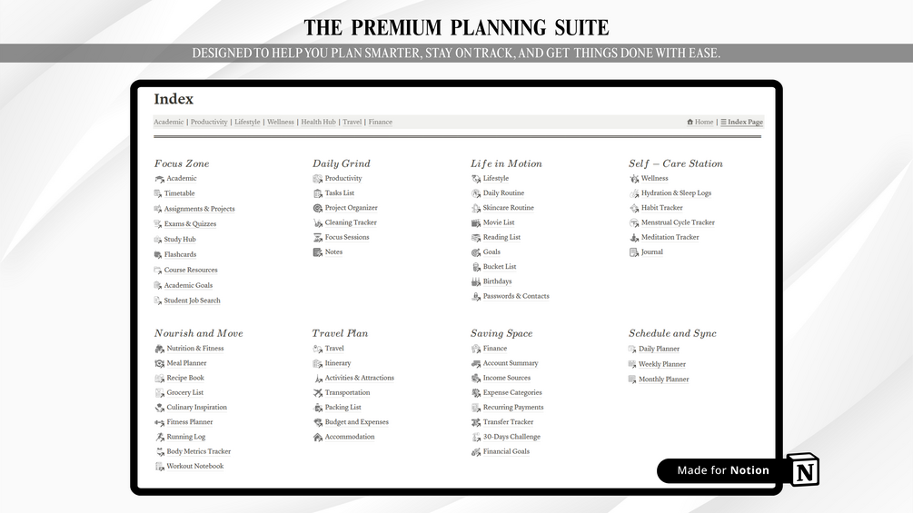 - Comprehensive Sections : Manage your life seamlessly with dedicated areas for SCHEDULE & SYNC, FOCUS ZONE, DAILY GRIND, LIFE-IN-MOTION, SELF-CARE STATION, NOURISH & MOVE, TRAVEL PLAN, AND SAVING SPACE.