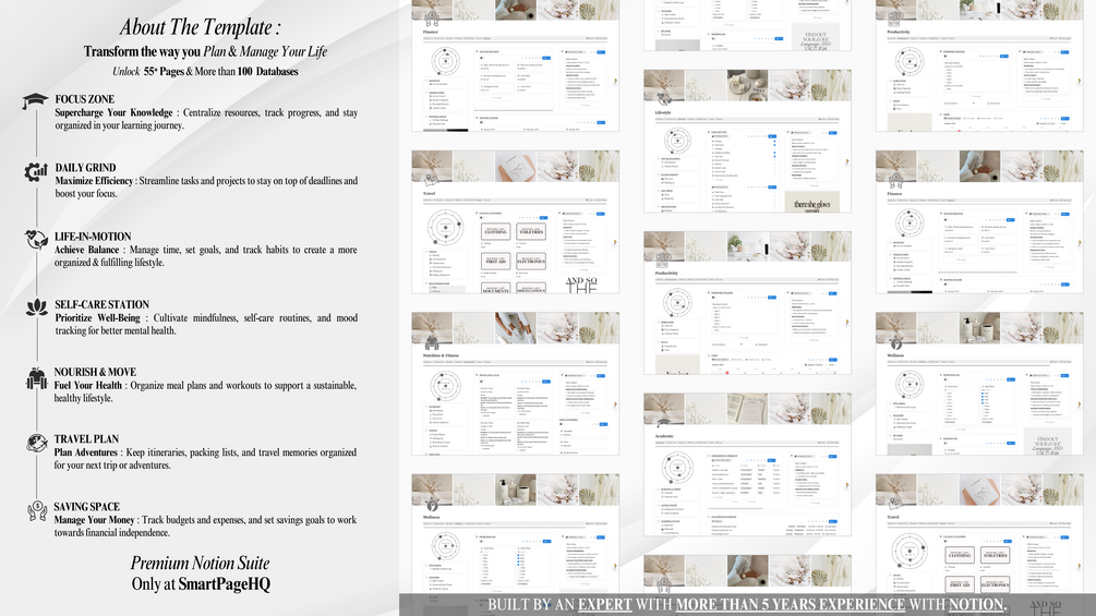 - Extensive Notion Template : Unlock 55+ beautifully designed pages and over 100+ databases for maximum efficiency.