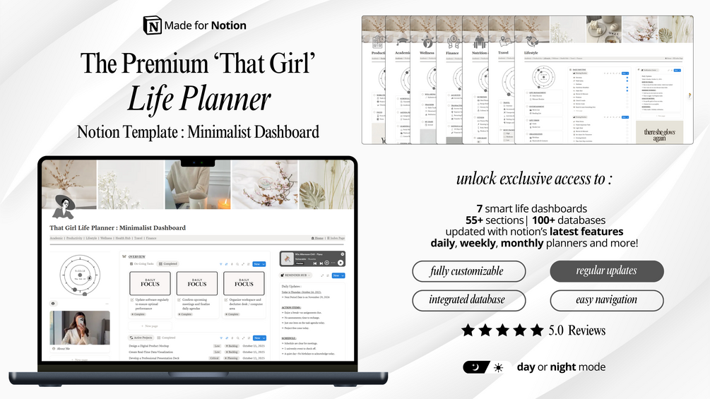 Premium 'That Girl' Life Planner : Minimalist Notion Template for Seamless Organization