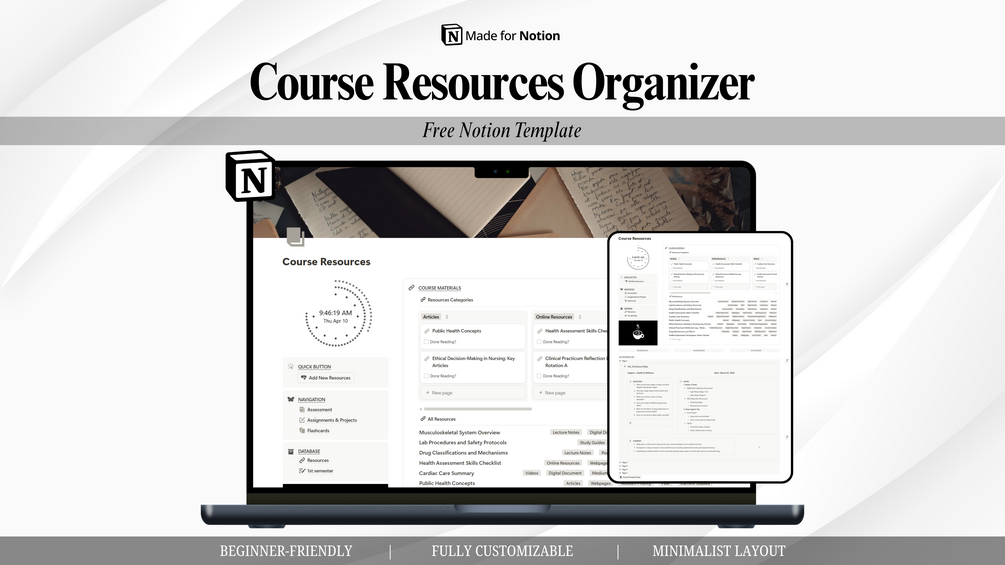Stay on top of your studies with this organized and easy-to-use Notion template designed to manage all your course materials in one central hub. Ideal for students and lifelong learners, this planner helps you keep track of lecture notes, reading lists, assignments, and key resources without the overwhelm.