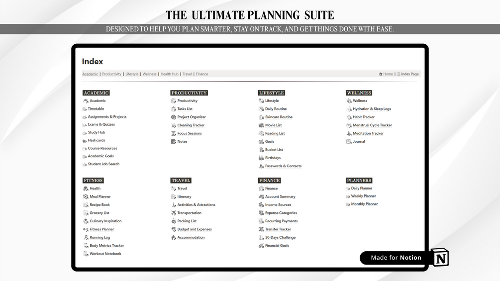 - Comprehensive Sections : Manage your life seamlessly with dedicated areas for LIFE PLANNERS, ACADEMIC HUB, PRODUCTIVITY, LIFESTYLE, WELLNESS, NUTRITION & FITNESS, TRAVEL, AND FINANCE.